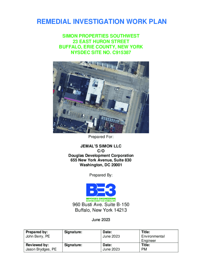 REMEDIAL INVESTIGATION WORK PLAN SIMON PROPERTIES SOUTHWEST 23 EAST HURON STREET BUFFALO, ERIE COUNTY, NEW YORK NYSE SITE NO. C915387Submitted For: Prepared For: JAMAL\'S SIMON LLC C/O Douglas Development