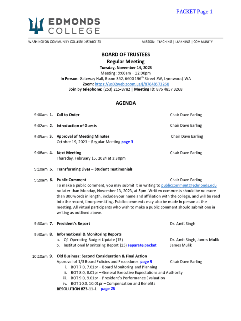 PACKET Page 1 WASHINGTON COMMUNITY COLLEGE DISTRICT 23MISSION: TEACHING | LEARNING | COMMUNITYBOARD OF TRUSTEES Regular Meeting Tuesday, November 14, 2023, Meeting: 9:00am 12:00pm In Person: Gateway