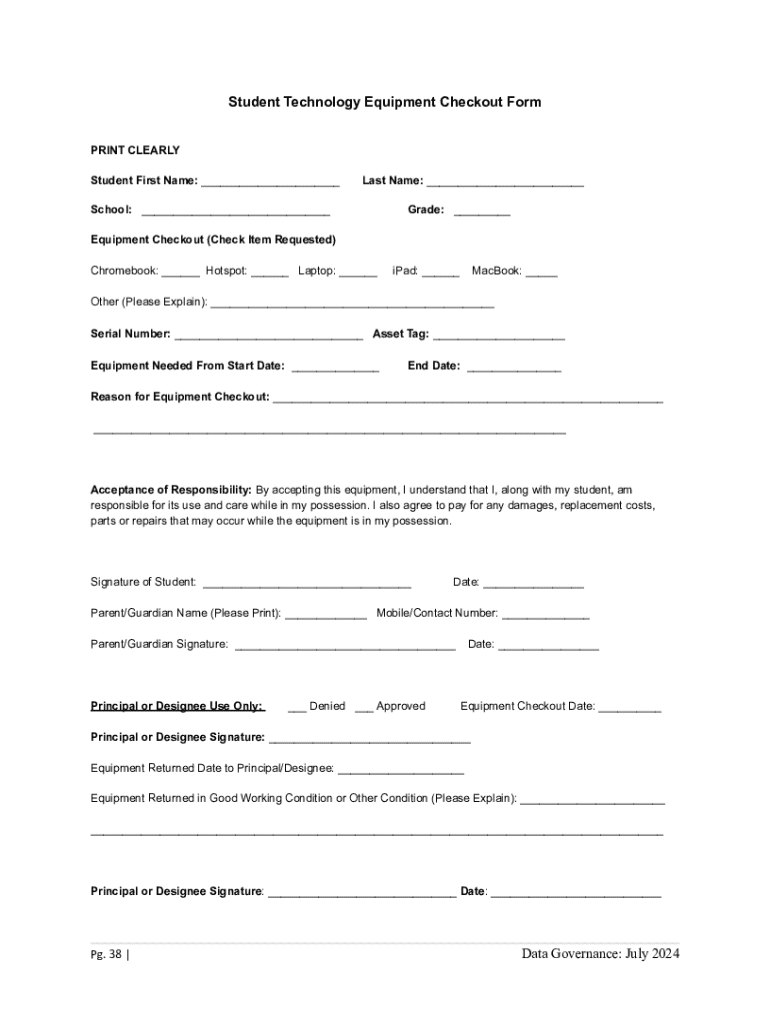 Student Technology Equipment Checkout Form PRINT CLEARLY Student First Name: ___Last Name: ___School: ___Grade: ___Equipment Checkout (Check Item Requested) Chromebook: ___ Hotspot: ___ Laptop: ___iPad:
