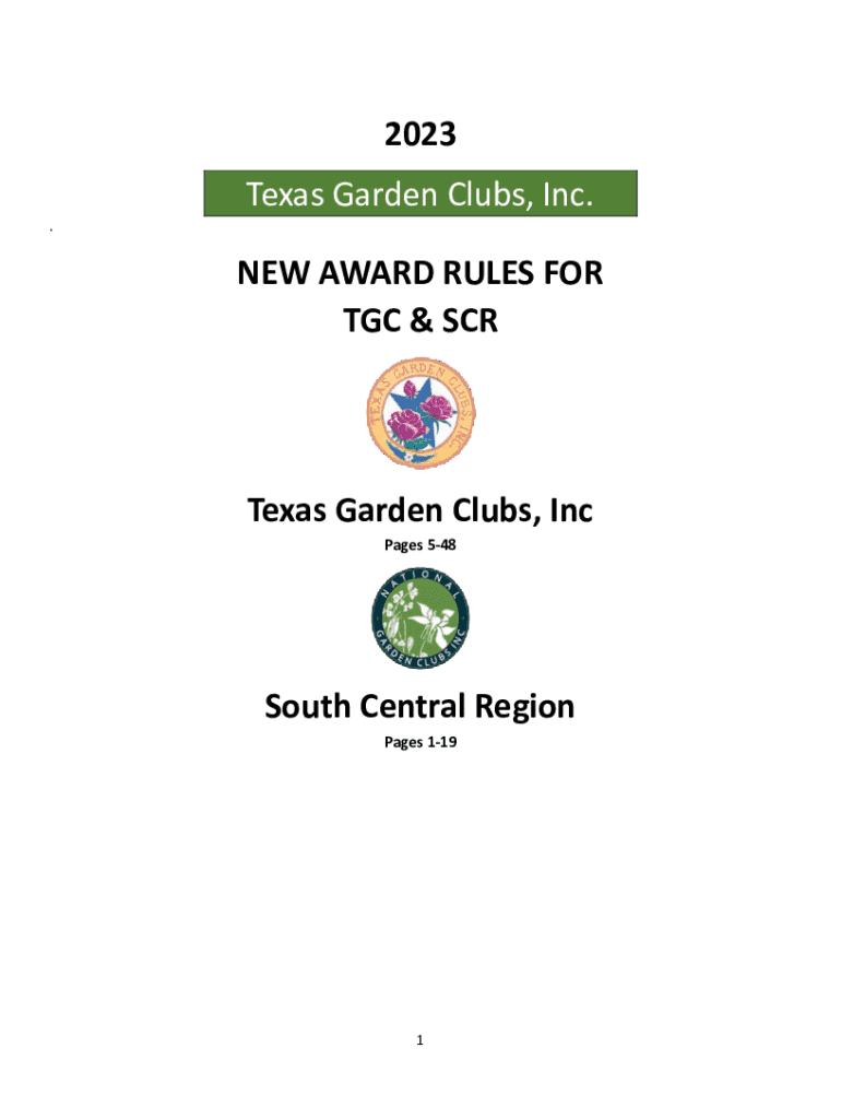 2023 Texas Garden Clubs, Inc..NEW AWARD RULES FOR NGC & SCR Texas Garden Clubs, Inc Pages 548South Central Region Pages 11912023 Texas Garden Clubs, Inc. AWARDS BROCHURE Published for the Members