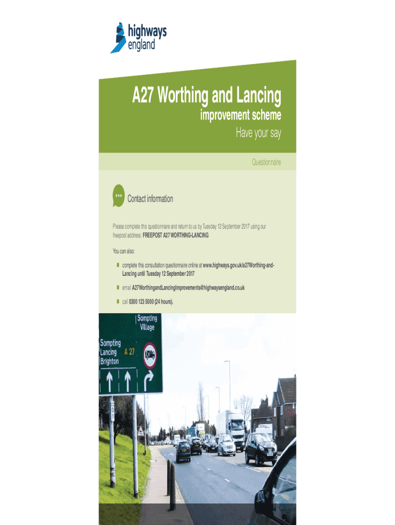 A27 Wort hing and Lancing improvement scheme Have your say QuestionnaireContact information Please complete this questionnaire and return to us by Tuesday 12 September 2017 using our free post address: