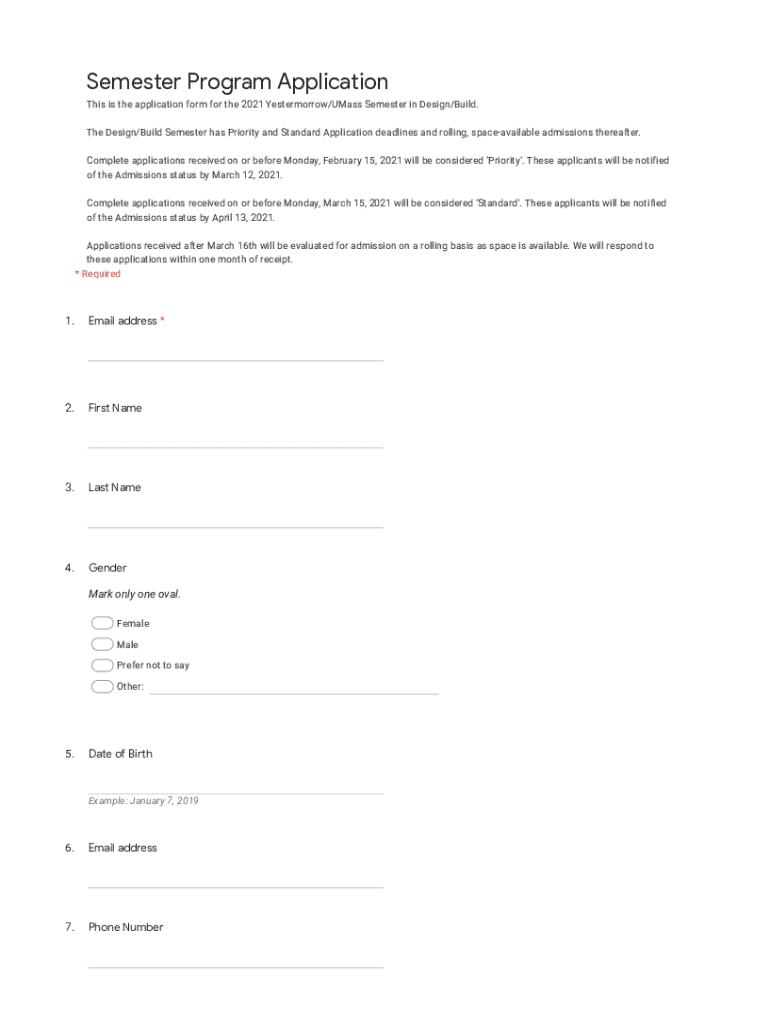 Semester Program Application This is the application form for the 2021 Yestermorrow/Mass Semester in Design/Build. The Design/Build Semester has Priority and Standard Application deadlines and rolling,
