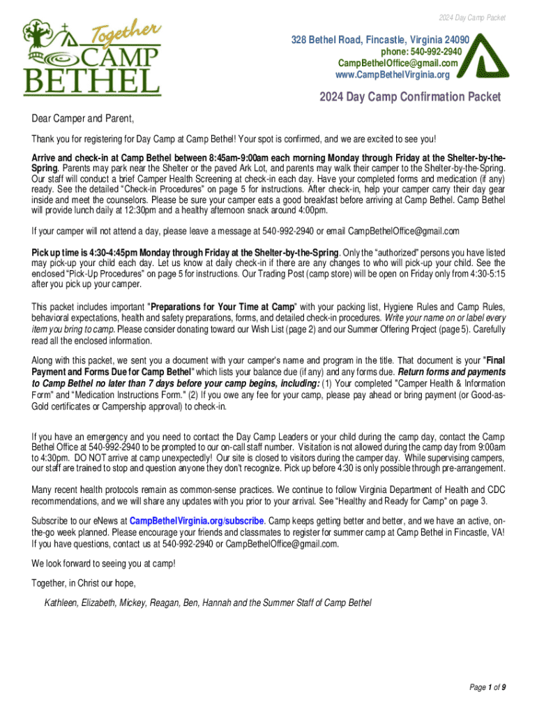 2024 Day Camp Packet328 Ethel Road, Fin castle, Virginia 24090 phone: 5409922940 CampBethelOffice@gmail.com www.CampBethelVirginia.org2024 Day Camp Confirmation Packet Dear Camper and Parent, Thank