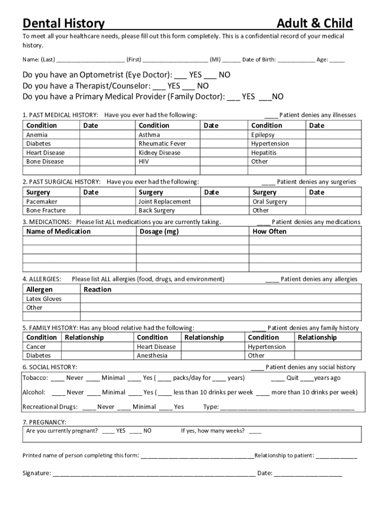 Dental HistoryAdult & ChildTo meet all your healthcare needs, please fill out this form completely. This is a confidential record of your medical history. Name: (Last) ___ (First) ___ (MI) ___ Date
