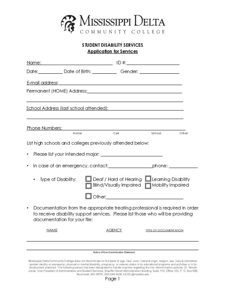 STUDENT DISABILITY SERVICES Application for Services Name:ID #:___Date:___ Date of Birth: ___ Gender: ___ Email address:___ Permanent (HOME) Address:___ ___ School Address (last school attended):___