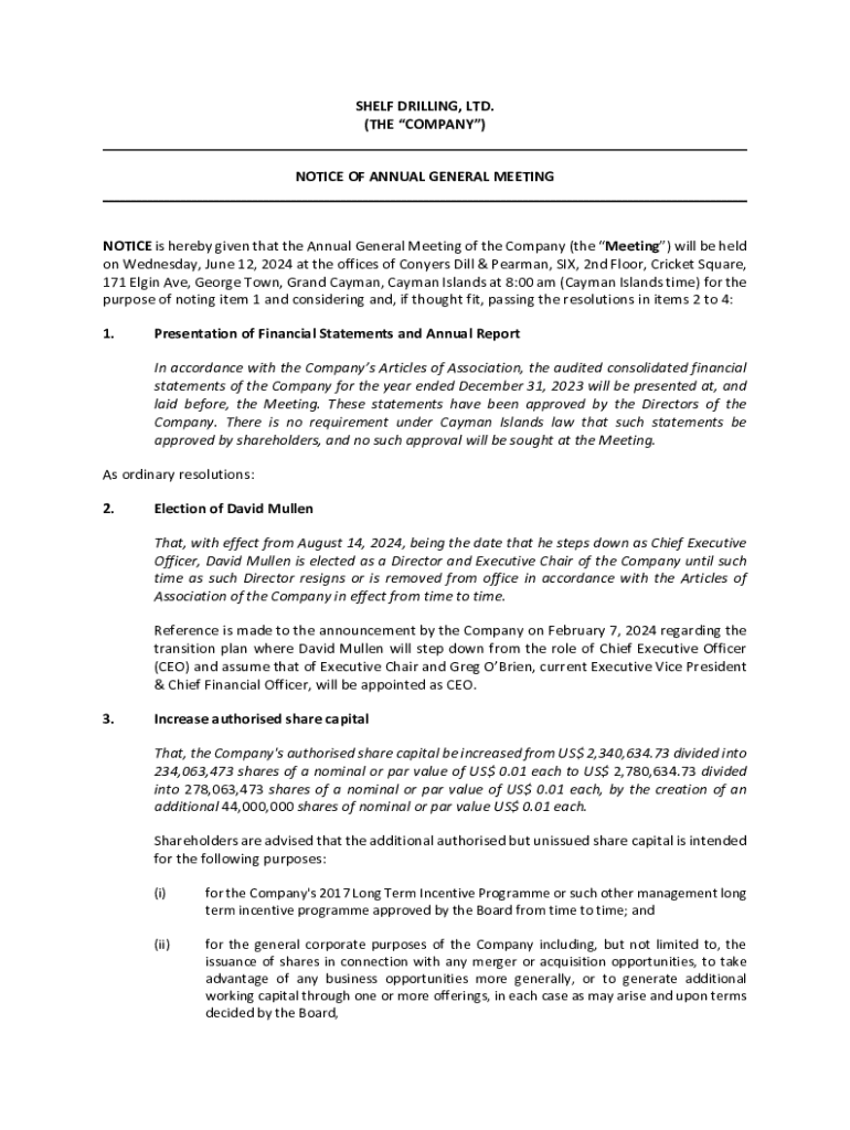 SHELF DRILLING, LTD. (THE COMPANY) NOTICE OF ANNUAL GENERAL MEETINGNOTICE is hereby given that the Annual General Meeting of the Company (the Meeting) will be held on Wednesday, June 12, 2024 at the