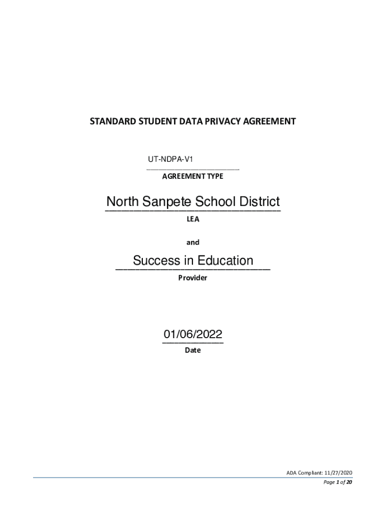 STANDARD STUDENT DATA PRIVACY AGREEMENTUTNDPAV1___ AGREEMENT TYPENorth Sanpete School District___ LEA andSuccess in Education ___ Provider01/06/2022 ___ DateADA Compliant: 11/27/2020 Page 1 of 20This