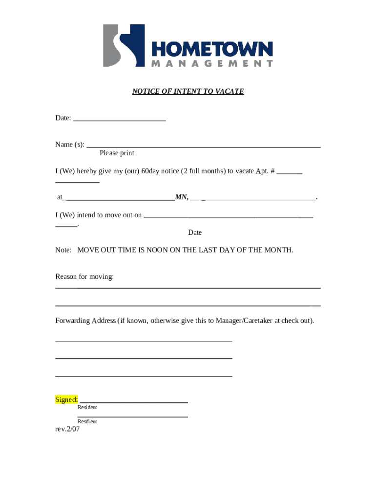 What is notice of intent to vacate 60 day notice required Form?
