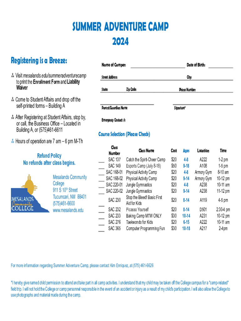 SUMMER ADVENTURE CAMP 2024 Registering is a Breeze: Visit mesalands.edu/summeradventurecamp to print the Enrollment Form and Liability Waiver Come to Student Affairs and drop off the selfprinted forms