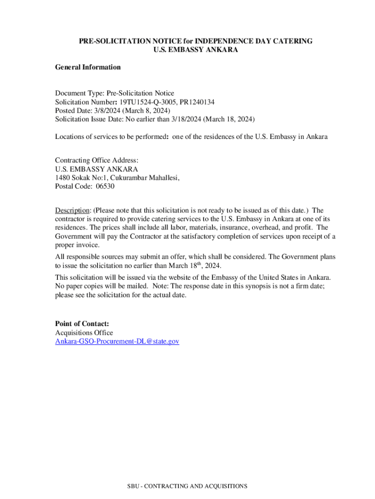 SOLICITATION NOTICE for INDEPENDENCE DAY CATERING U.S. EMBASSY ANKARA General InformationDocument Type: Solicitation Notice Solicitation Number: 19TU1524Q3005, PR1240134 Posted Date: 3/8/2024 (March