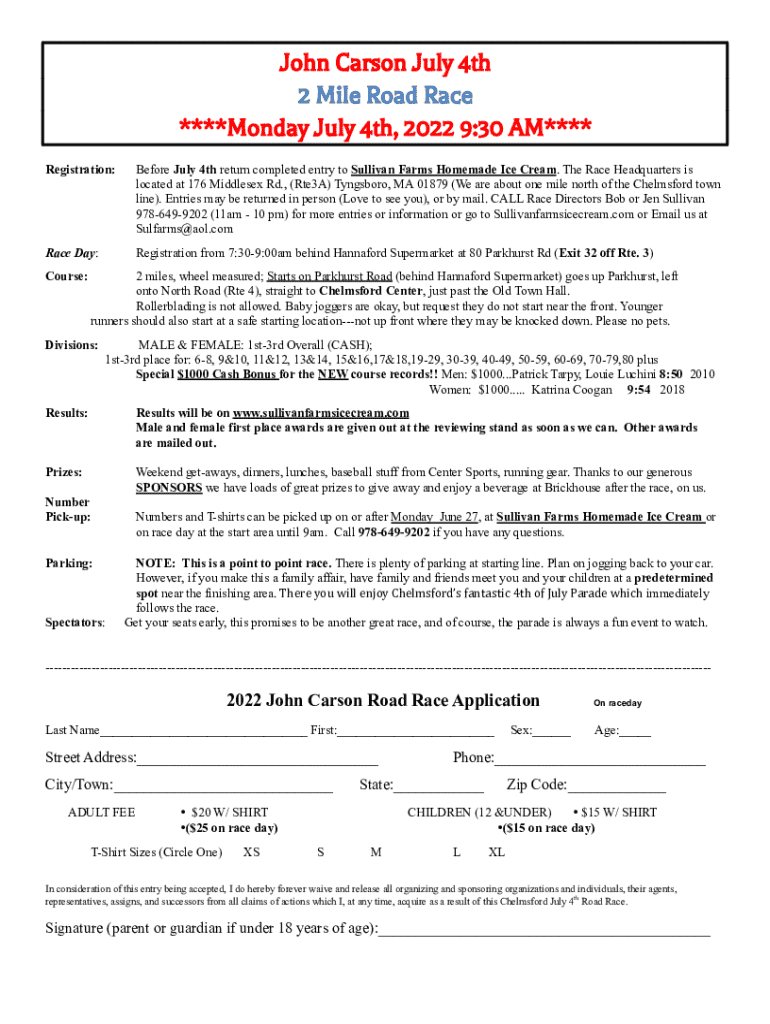 Registration:Before July 4th return completed entry to Sullivan Farms Homemade Ice Cream. The Race Headquarters is
