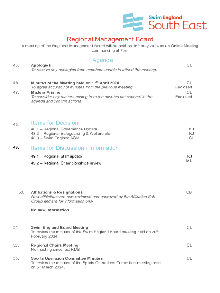 Regional Management Board A meeting of the Regional Management Board will be held on 16th may 2024 as an Online Meeting commencing at 7pmAgenda 45.Apologies To receive any apologies from members unable