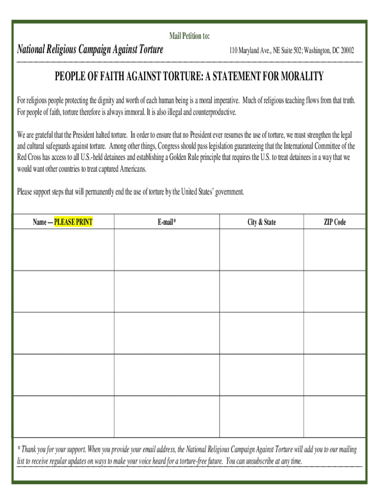 Mail Petition to:National Religious Campaign Against Torture110 Maryland Ave., NE Suite 502; Washington, DC 20002PEOPLE OF FAITH AGAINST TORTURE: A STATEMENT FOR MORALITY For religious people protecting
