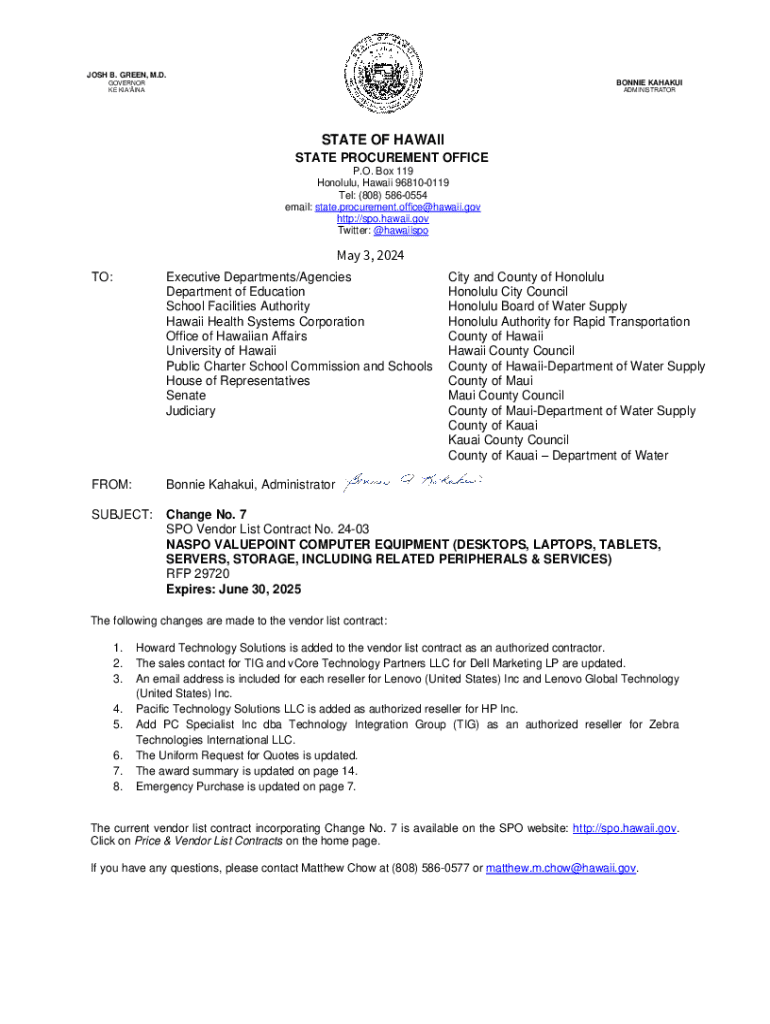 JOSH B. GREEN, M.D. BONNIE KAHAKUIGOVERNOR KE KIAINAADMINISTRATORSTATE OF HAWAII STATE PROCUREMENT OFFICE P.O. Box 119 Honolulu, Hawaii 968100119 Tel: (808) 5860554 email: state.procurement.office@hawaii.gov