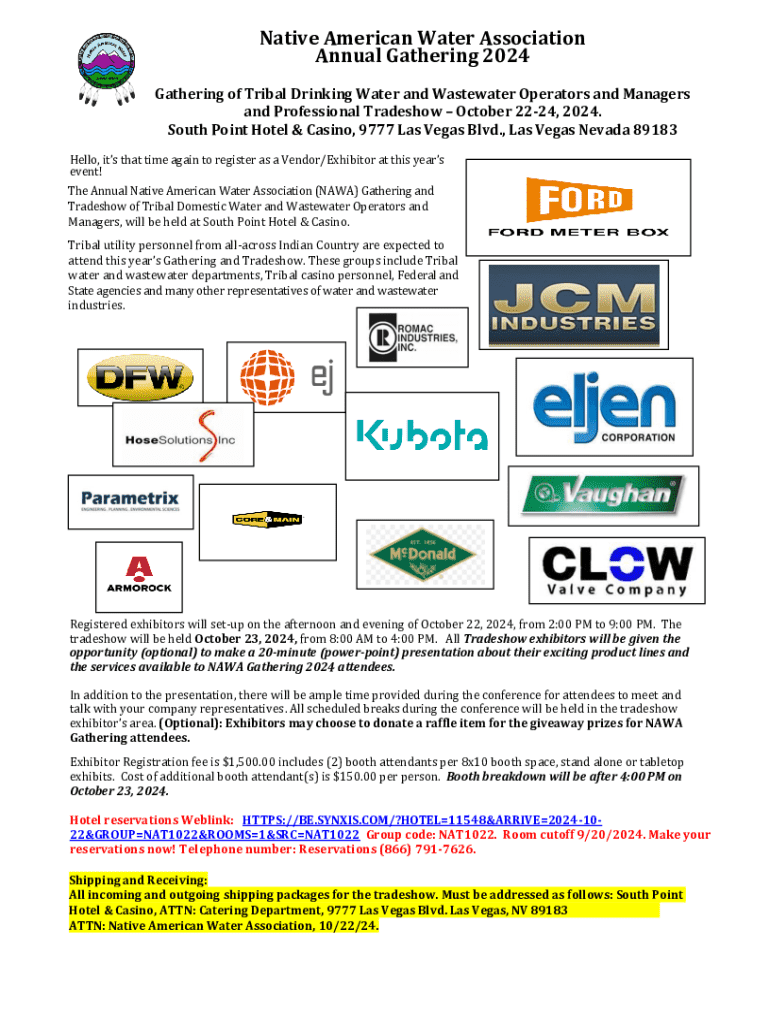 Native American Water Association Annual Gathering 2024 Gathering of Tribal Drinking Water and Wastewater Operators and Managers and Professional Tradeshow October 2224, 2024. South Point Hotel &