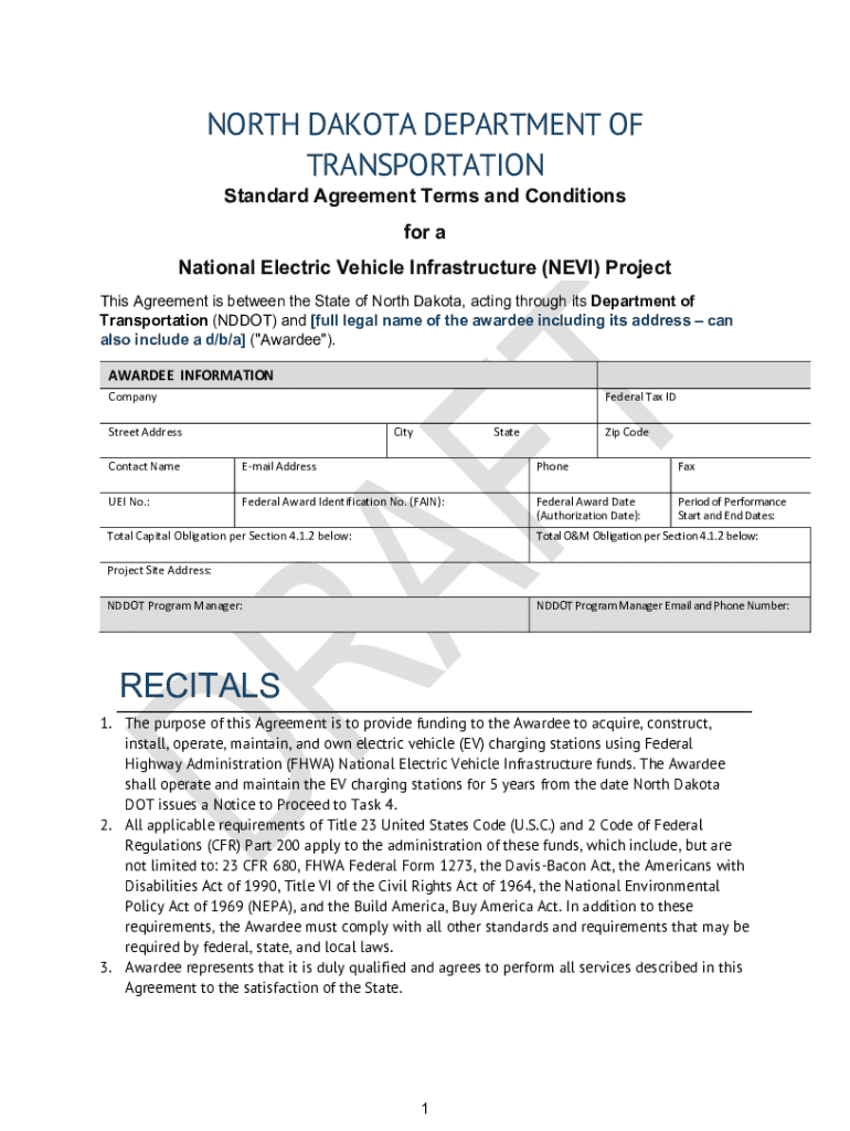 NORTH DAKOTA DEPARTMENT OF TRANSPORTATION Standard Agreement Terms and Conditions for a National Electric Vehicle Infrastructure (NEVI) Project This Agreement is between the State of North Dakota,