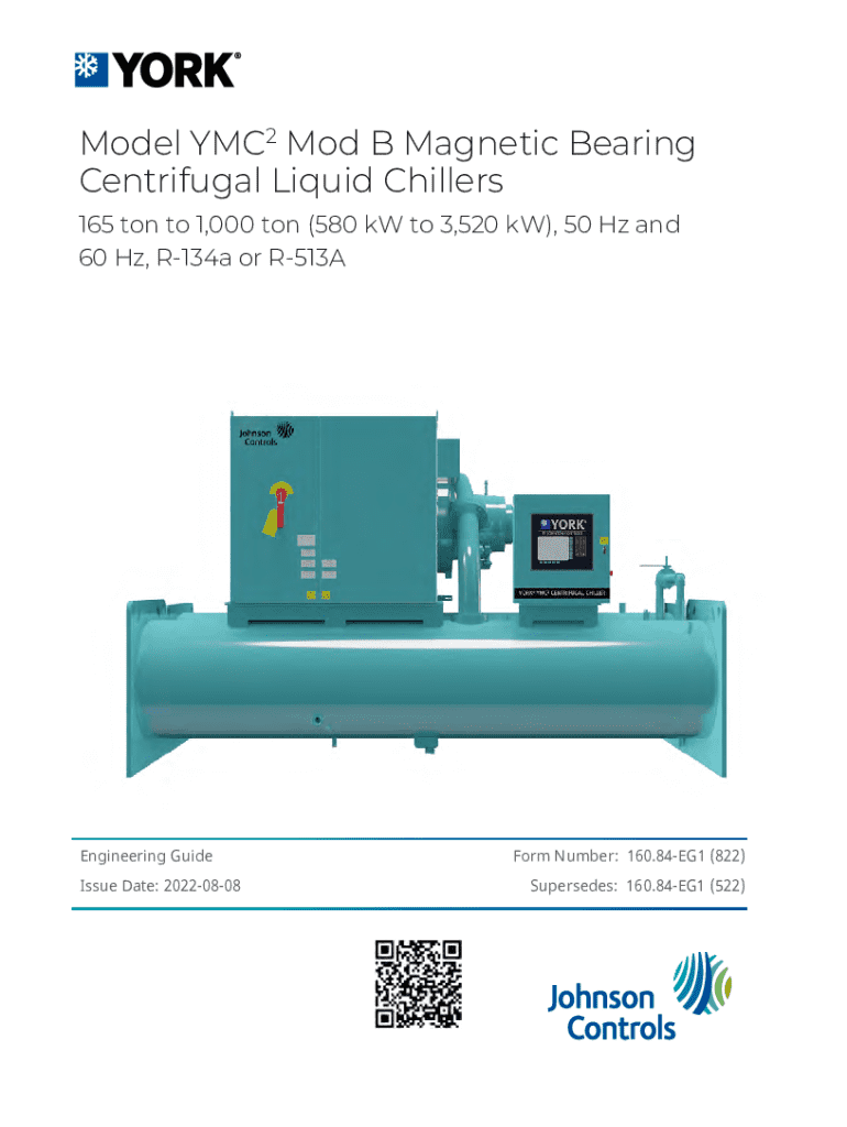Model YMC2 Mod B Magnetic Bearing Centrifugal Liquid Chillers 165 ton to 1,000 ton (580 kW to 3,520 kW), 50 Hz and 60 Hz, R134a or R513AEngineering Guide Issue Date: 20220808Form Number: 160.84EG1