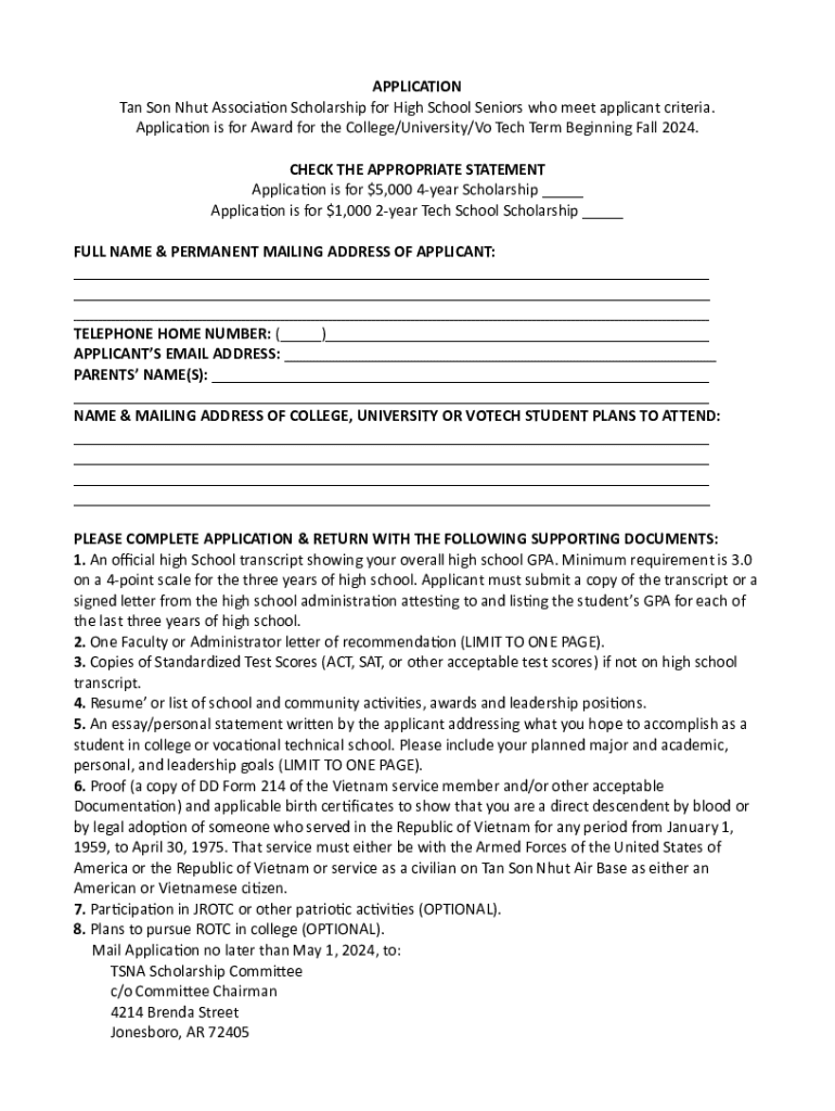 APPLICATION Tan Son Nhut Association Scholarship for High School Seniors who meet applicant criteria. Application is for Award for the College/University/Vo Tech Term Beginning Fall 2024. CHECK THE