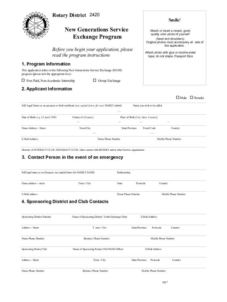 Rotary DistrictSmile!New Generations Service Exchange ProgramAttach or insert a recent, goodquality color photo of yourself (head and shoulders). Original photos must accompany all sets of the application.Before