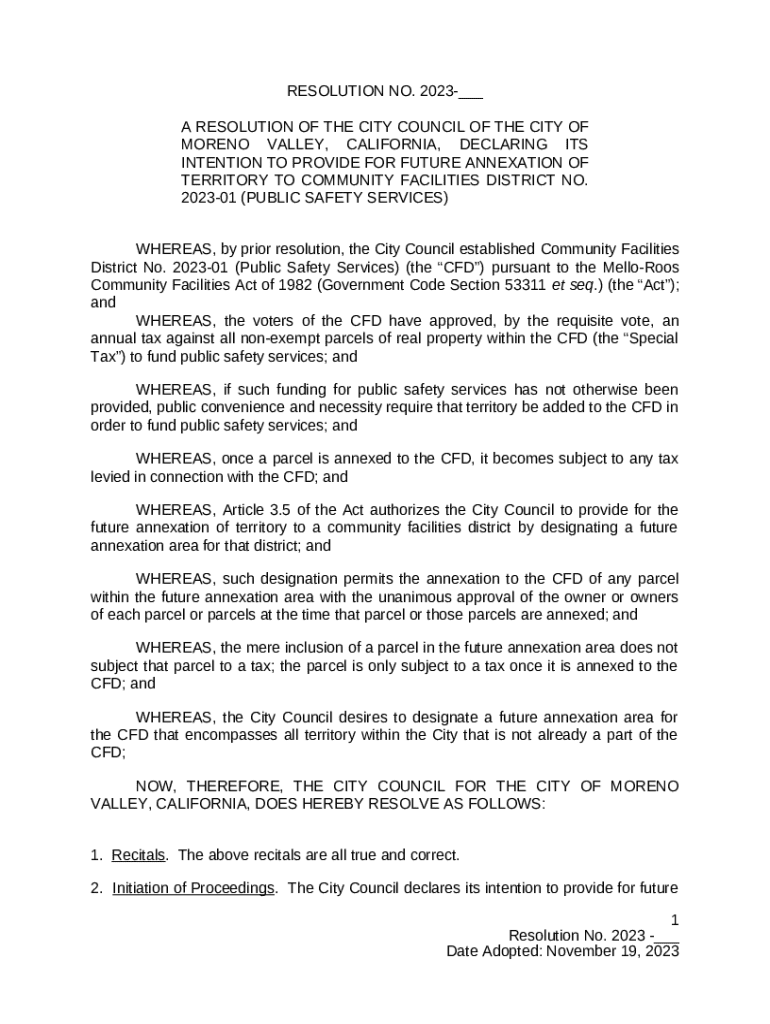 - Search for the A RESOLUTION OF THE CITY COUNCIL OF THE CITY OF MORENO VALLEY, CALIFORNIA, DECLARING ITS INTENTION TO PROVIDE FOR FUTURE ANNEXATION OF TERRITORY TO COMMUNITY FACILITIES DISTRICT NO from the PDFfiller’s catalogue.