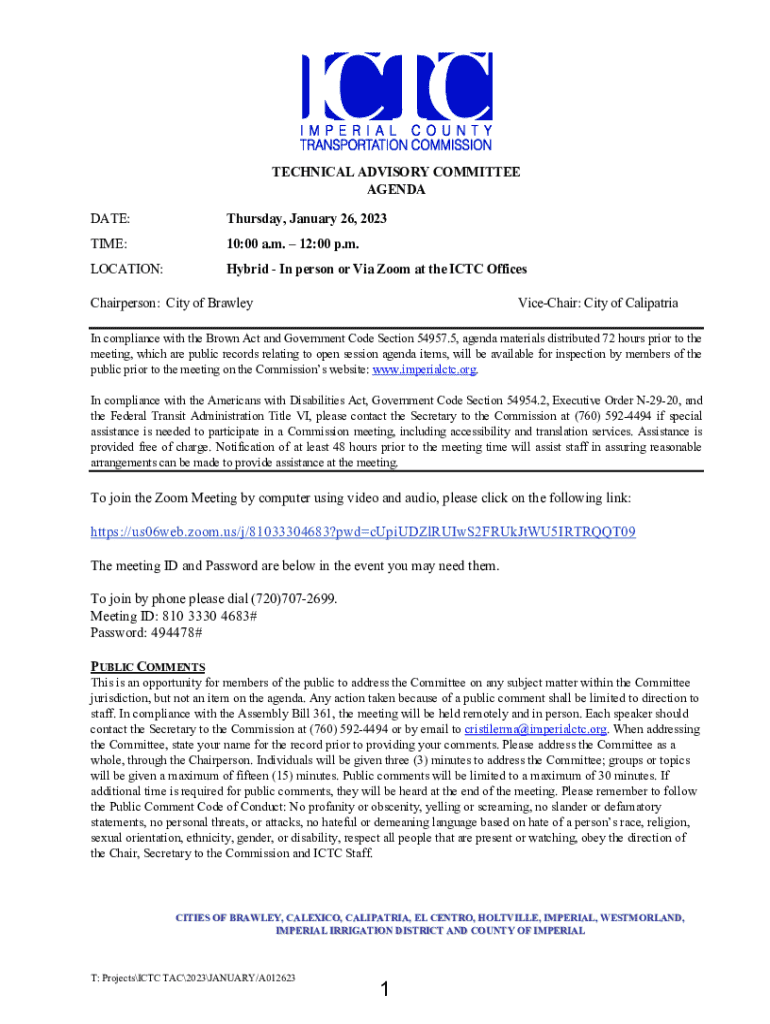 DATE:Thursday, January 26, 2023TIME:10:00 a.m. 12:00 p.m.LOCATION:Hybrid In person or Via Zoom at the ICT OfficesChairperson: City of BrawleyViceChair: City of