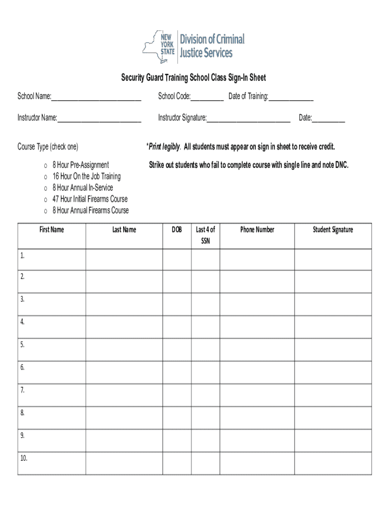 Security Guard Training School Class SignIn Sheet School Name:___School Code:___ Date of Training:___Instructor Name:___Instructor Signature:___*Print legibly. All students must appear on sign in