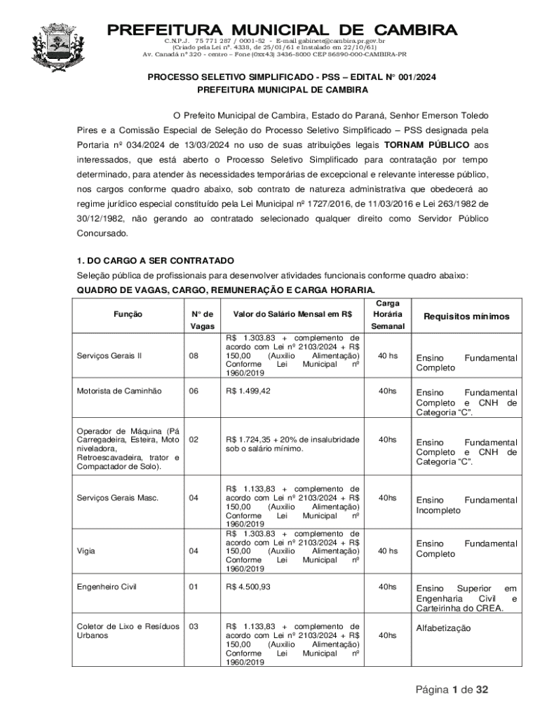 C.N.P.J. 75 771 287 / 000152 Email gabinete@cambira.pr.gov.br (Cried plea Lei n. 4338, DE 25/01/61 e Instead em 22/10/61) Av. Canad n 320 CENTR One (0xx43) 34368000 CEP 86890000CAMBIRAPRPROCESSO SELECTIVE