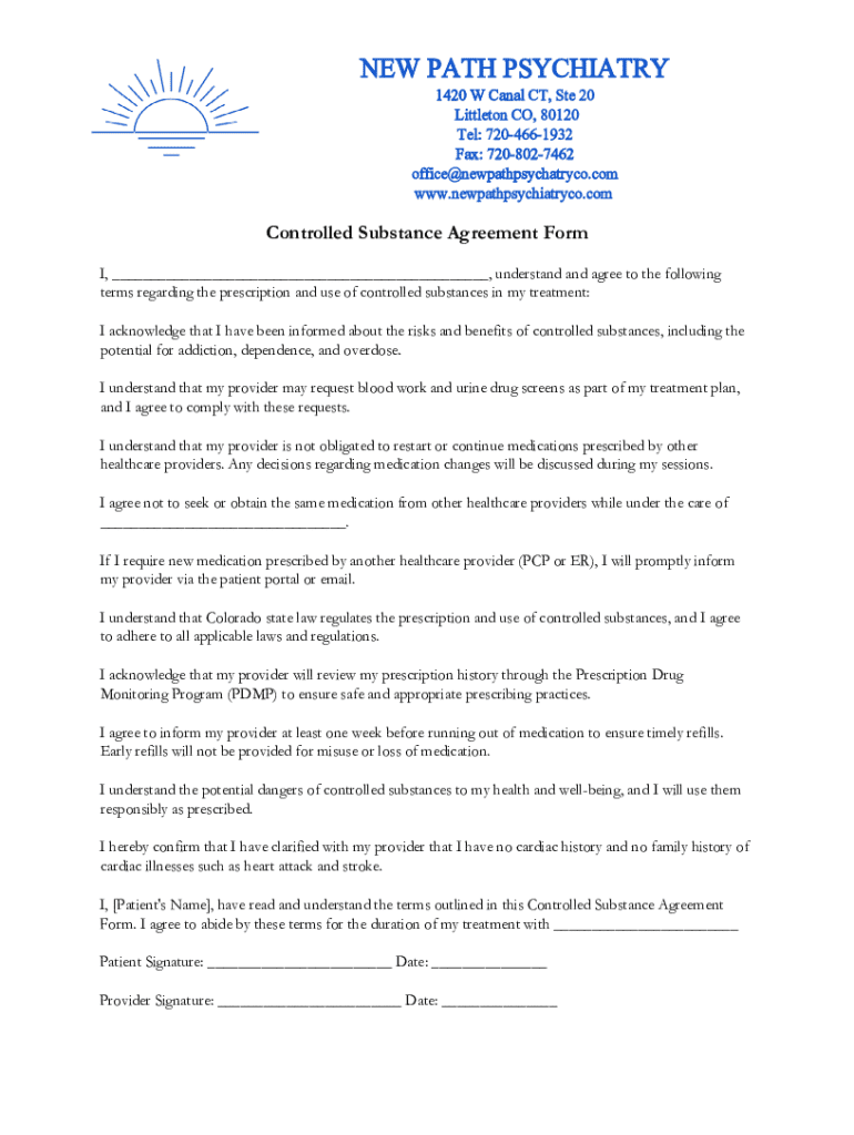 NEW PATH PSYCHIATRY 1420 W Canal CT, Ste 20 Littleton CO, 80120 Tels: 7204661932 Fax: 7208027462 office@newpathpsychatryco.com www.newpathpsychiatryco.comControlled Substance Agreement Form I, ___,
