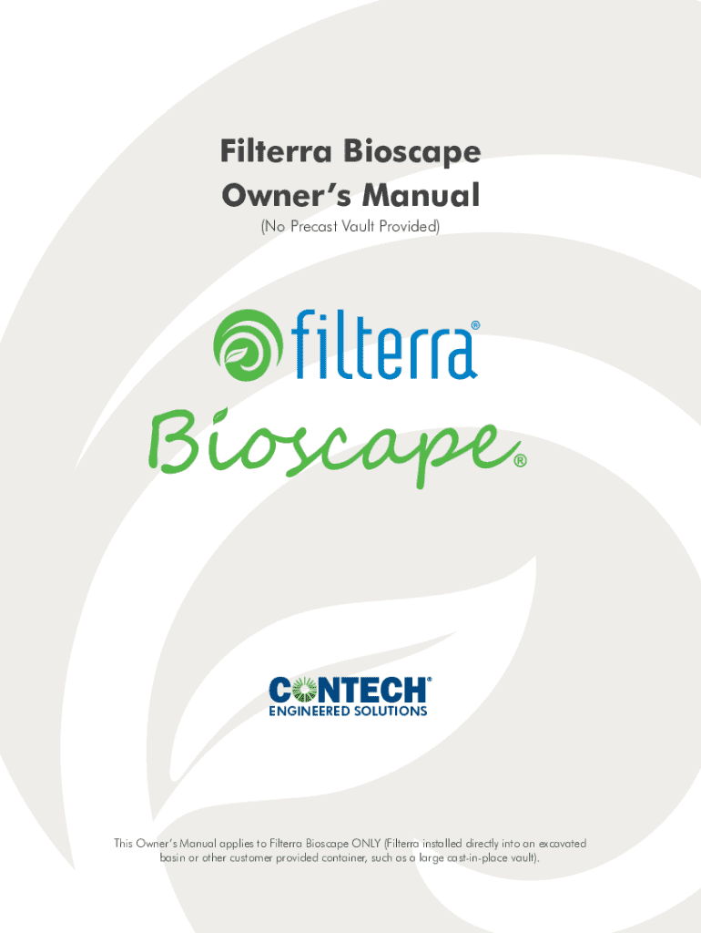 Filter Bios cape Owners Manual (No Precast Vault Provided) ENGINEERED SOLUTIONSThis Owners Manual applies to Filter Bios cape ONLY (Filter installed directly into an excavated basin or other customer