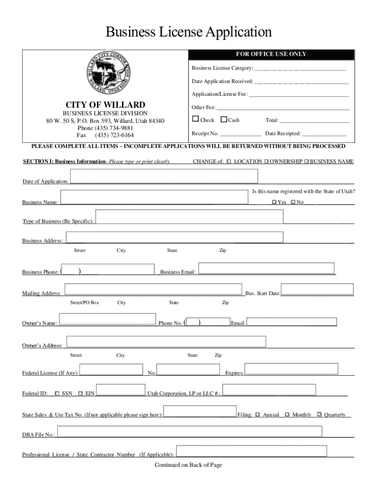 Application/License Fee: ___CITY OF WILLARDOther Fee: ___BUSINESS LICENSE DIVISION