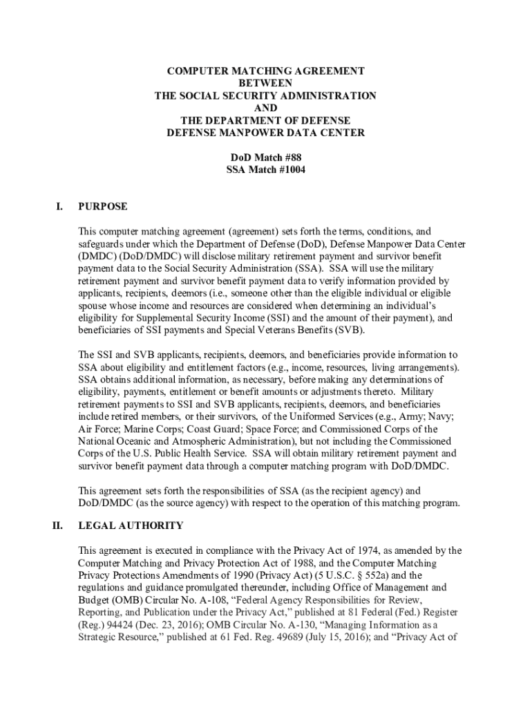 COMPUTER MATCHING AGREEMENT BETWEEN THE SOCIAL SECURITY ADMINISTRATION AND THE DEPARTMENT OF DEFENSE MANPOWER DATA CENTER DoD Match #88 SSA Match #1004 I.PURPOSE This computer matching agreement (agreement)