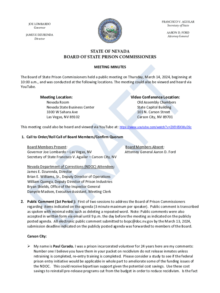 FRANCISCO V. AGUILAR Secretary of State LOMBARDO GovernorAARON D. FORD Attorney Generalizes E BRENDA Directorate OF NEVADA BOARD OF STATE PRISON COMMISSIONERS MEETING MINUTES The Board of State Prison