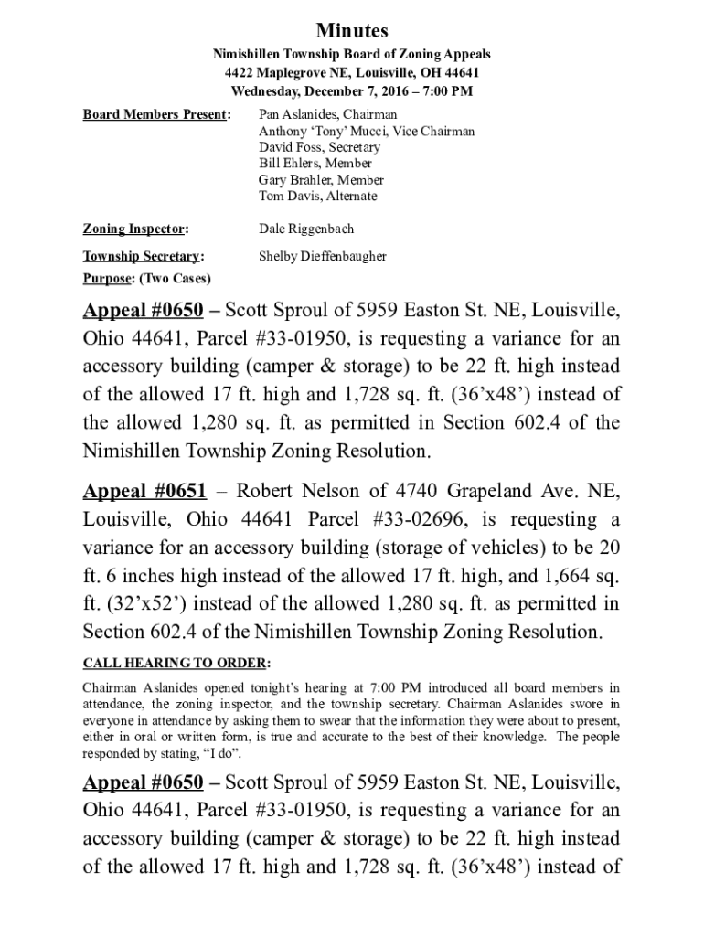 Minutes Nimishillen Township Board of Zoning Appeals 4422 Maple grove NE, Louisville, OH 44641 Wednesday, December 7, 2016 7:00 PM Board Members Present:Pan Islands, Chairman Anthony Tony Gucci, Vice