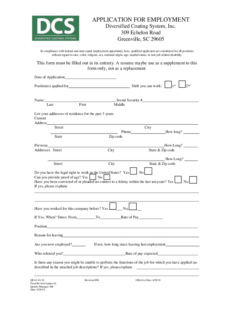 APPLICATION FOR EMPLOYMENT Diversified Coating System, Inc. 309 Echelon Road Greenville, SC 29605 In compliance with federal and state equal employment opportunity laws, qualified applicants are considered