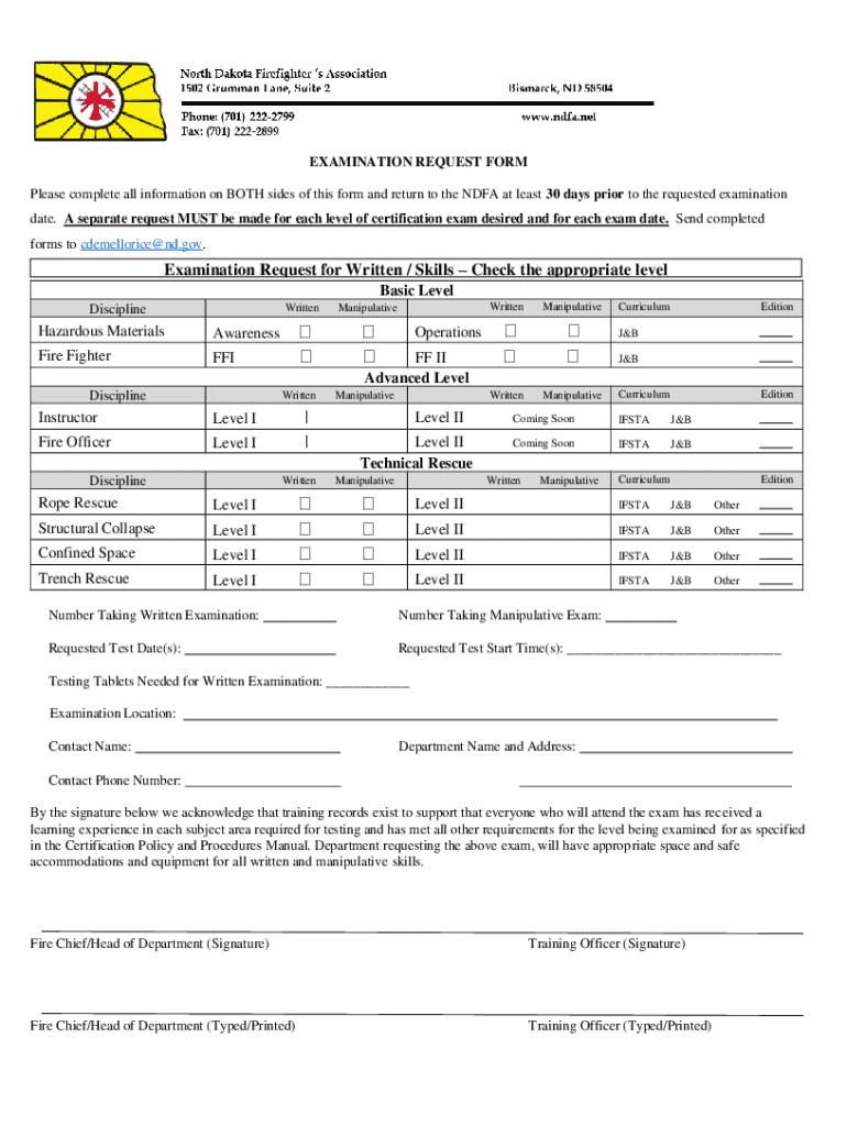 Please complete all information on BOTH sides of this form and return to the DFA at least 30 days prior to the requested examination