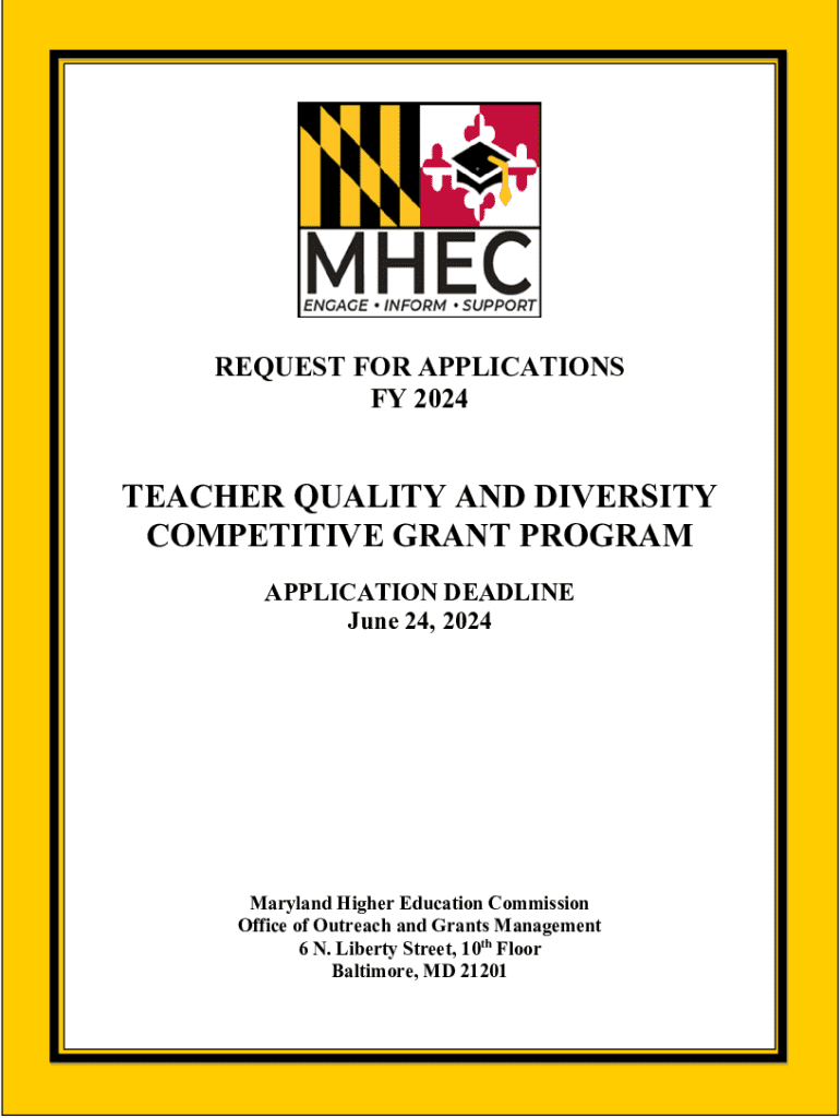 REQUEST FOR APPLICATIONS FY 2024TEACHER QUALITY AND DIVERSITY COMPETITIVE GRANT PROGRAM APPLICATION DEADLINE June 24, 2024Maryland Higher Education Commission Office of Outreach and Grants Management