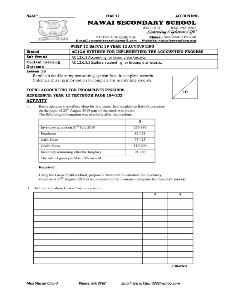 NAME: ___YEAR 12ACCOUNTINGWHSP 12 BATCH 19 YEAR 12 ACCOUNTING Strand AC12.6 SYSTEMS FOR IMPLEMENTING THE ACCOUNTING PROCESS Sub Strand AC 12.6.3 Accounting for Incomplete Records Content Learning