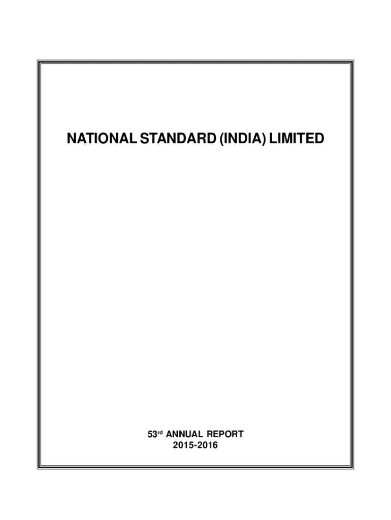 NATIONAL STANDARD (INDIA) LIMITED53rd ANNUAL REPORT 20152016NATIONAL STANDARD (INDIA) LIMITEDTABLE OF CONTENTS Contents Information about the CompanyPage No. 3Notice to Members4 19Boards Report20