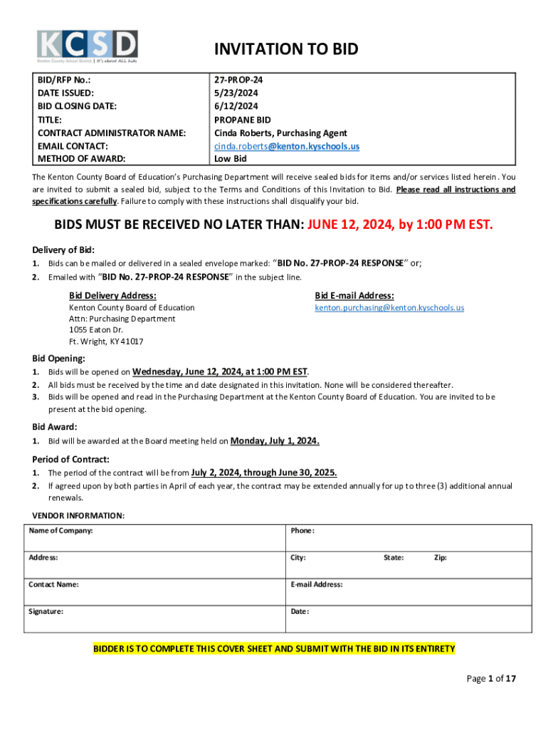 INVITATION TO BID/RFP No.: DATE ISSUED: BID CLOSING DATE: TITLE: CONTRACT ADMINISTRATOR NAME: EMAIL CONTACT: METHOD OF AWARD:27PROP24 5/23/2024 6/12/2024 PROPANE BID Linda Roberts, Purchasing Agent