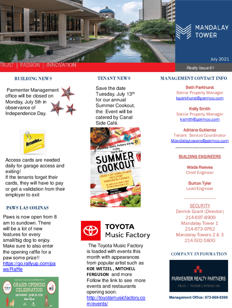 July 2021 Realty Issue 61BUILDING NEWS Parmenter Management office will be closed on Monday, July 5th in observance of Independence Day.TENANT NEWS Save the date Tuesday, July 13th for our annual