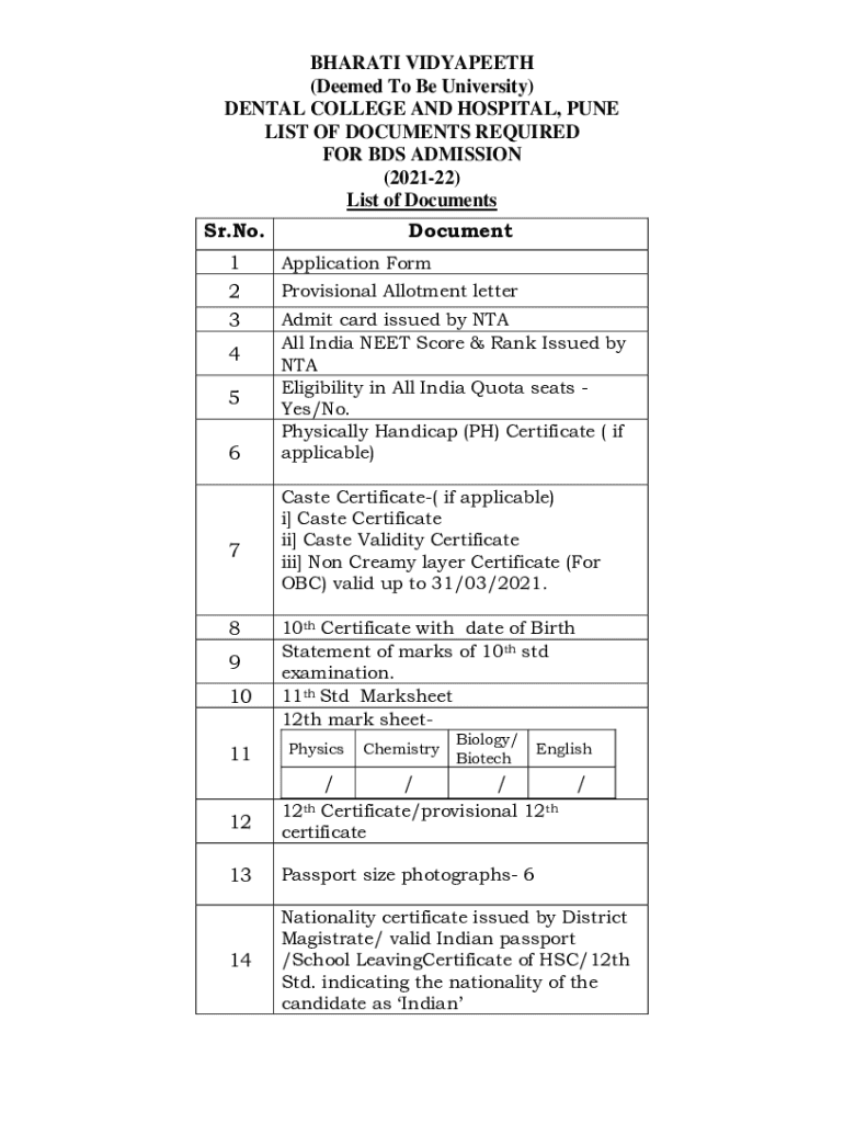 BHARAT VIDYAPEETH (Deemed To Be University) DENTAL COLLEGE AND HOSPITAL, PUNE LIST OF DOCUMENTS REQUIRED FOR BDS ADMISSION (202122) List of Documents Sr. No. 1 2 3 4 5 678 9 10 11 12Document Application
