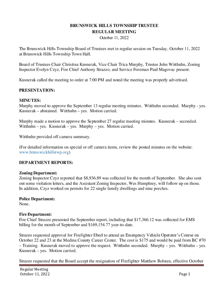 BRUNSWICK HILLS TOWNSHIP TRUSTEE REGULAR MEETING October 11, 2022, The Brunswick Hills Township Board of Trustees met in regular session on Tuesday, October 11, 2022, at Brunswick Hills Township Town
