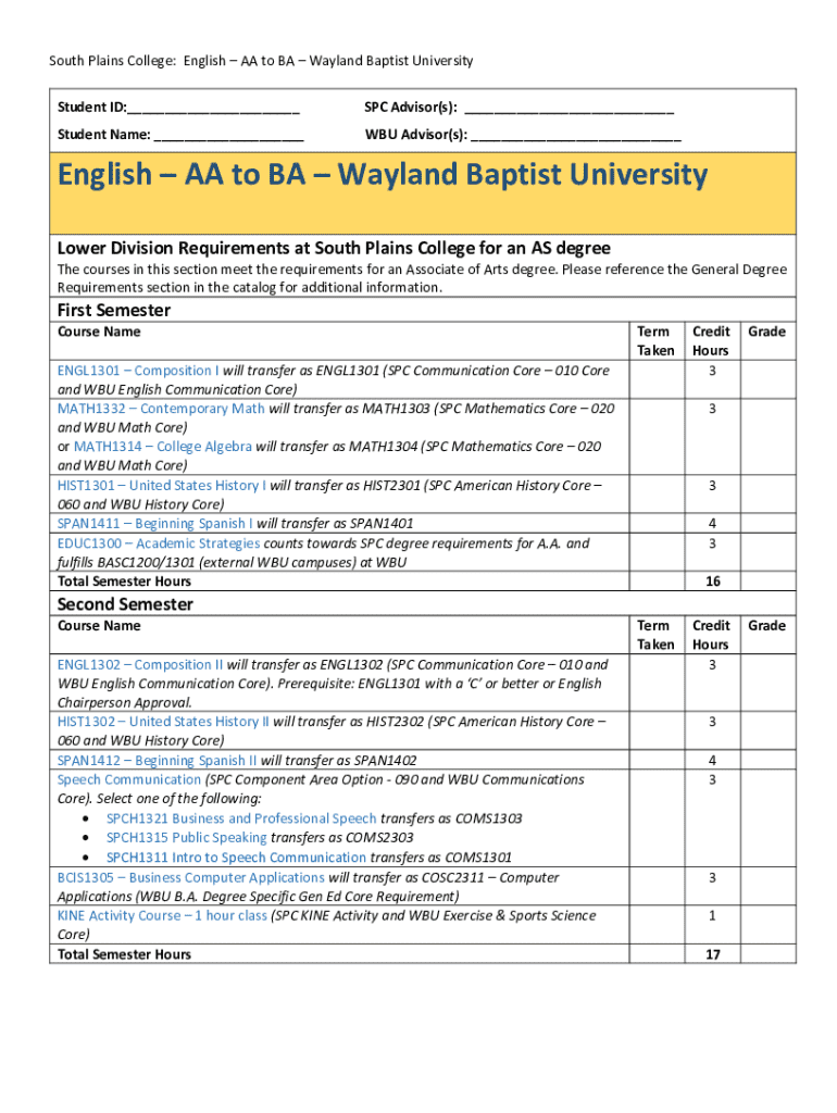 South Plains College: English AA to BA Wayland Baptist University Student ID:___SPC Advisor(s): ___Student Name: ___WBU Advisor(s): ___English AA to BA Wayland Baptist University Lower Division Requirements