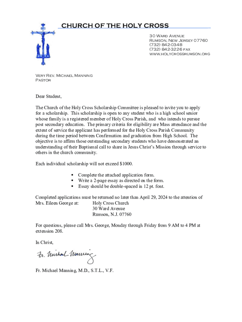 CHURCH OF THE HOLY CROSS 30 Ward Avenue Rumson, New Jersey 07760 (732) 8420348 (732) 8423226 fax www.holycrossrumson.orgVery Rev. Michael Manning PastorDear Student, The Church of the Holy Cross Scholarship