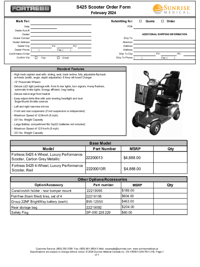 S425 Scooter Order Form February 2024Mark For:Submitting for:Date:PO#:QuoteOrderDealer Acct #: Dealer:ADDITIONAL SHIPPING INFORMATIONDealer Contact:Ship To:Dealer Address:Attention:Dealer City:PV:Dealer