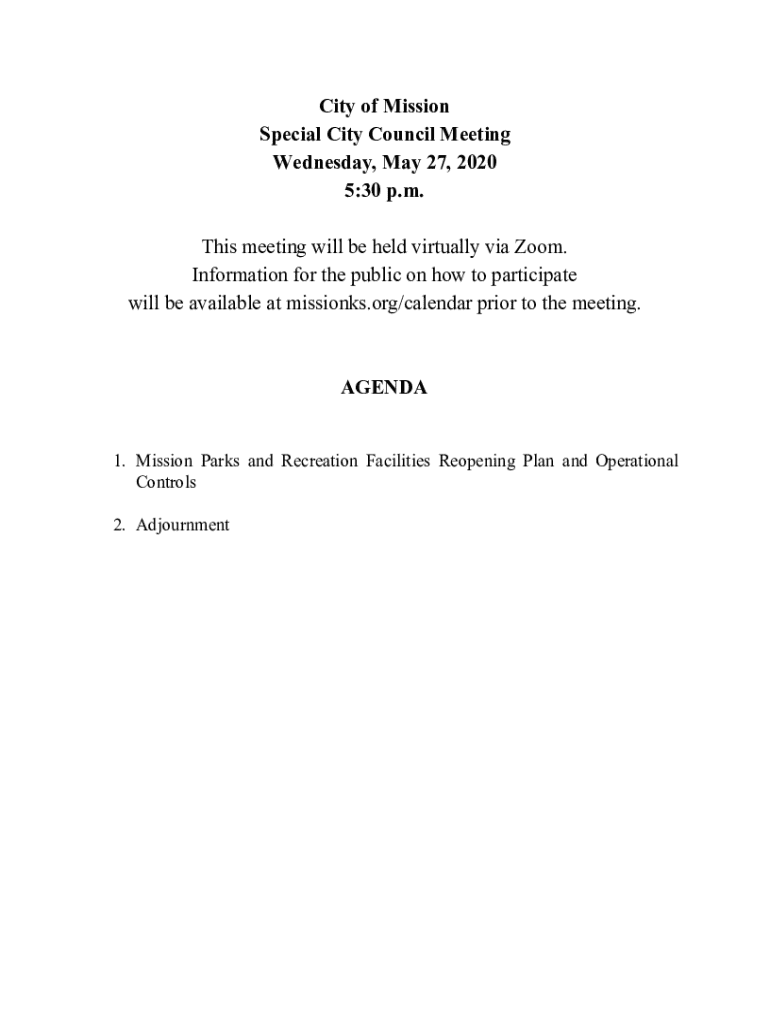 City of Mission Special City Council Meeting Wednesday, May 27, 2020 5:30 p.m. This meeting will be held virtually via Zoom. Information for the public on how to participate will be available at missionks.org/calendar
