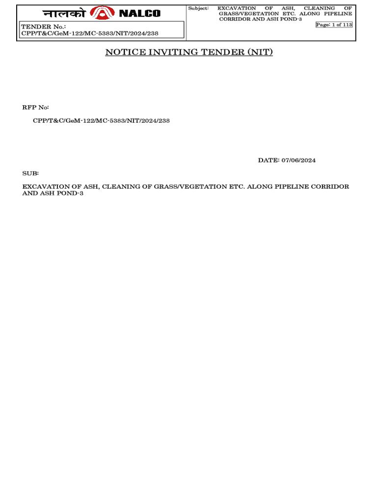 Subject:TENDER No.: CPP/T&C/GeM122/MC5383/NIT/2024/238EXCAVATION OF ASH, CLEANING OF GRASS/VEGETATION ETC. ALONG PIPELINE CORRIDOR AND ASH POND3 Page: 1 of 113NOTICE INVITING TENDER (NIT)RFP No: CPP/T&C/GeM122/MC5383/NIT/2024/238DATE: