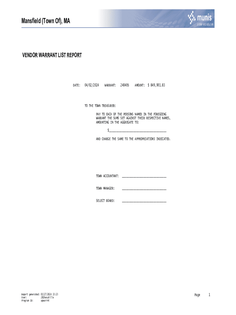 Mansfield (Town Of), VENDOR WARRANT LIST REPORTAGE:04/02/2024WARRANT:24040SAMOUNT:$849,901.83TO THE TOWN TREASURER: PAY TO EACH OF THE PERSONS NAMED IN THE FOREGOING WARRANT THE SUMS SET AGAINST THEIR