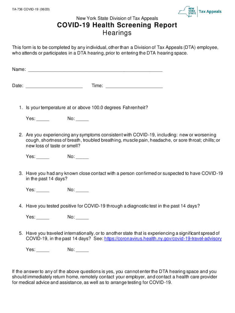 TA736 COVID19 (06/20)New York State Division of Tax AppealsCOVID19 Health Screening Report Hearings This form is to be completed by any individual, other than a Division of Tax Appeals (DTA) employee,