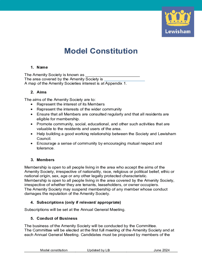 Model Constitution 1. Name The Amenity Society is known as ___ The area covered by the Amenity Society is ___ A map of the Amenity Societies interest is at Appendix 1. 2. Aims The aims of the Amenity
